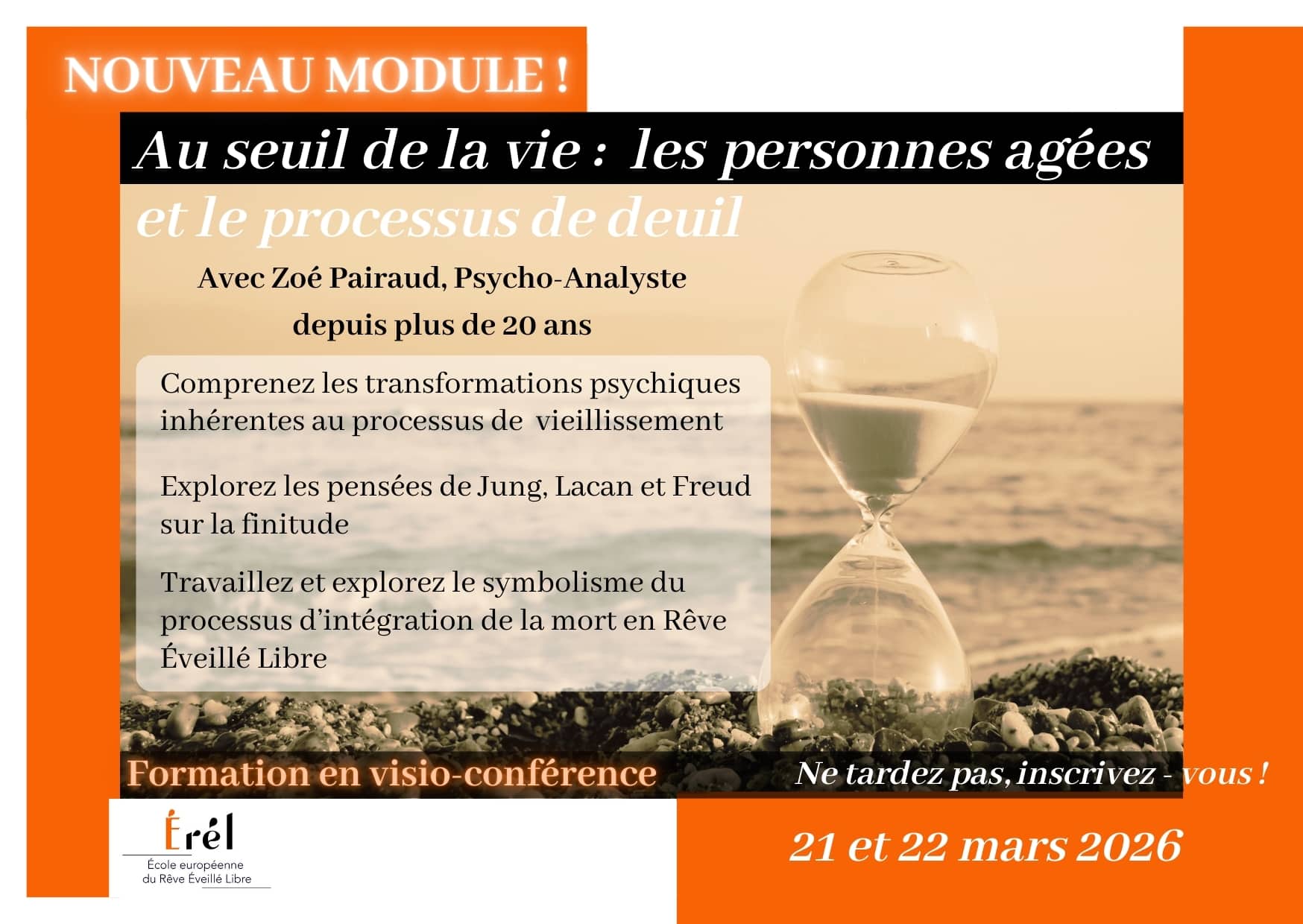 Ce module de formation vous initie aux processus psychiques du vieillissement et du deuil, en articulant les grands référents de la psychanalyse avec la pratique vivante du REL.